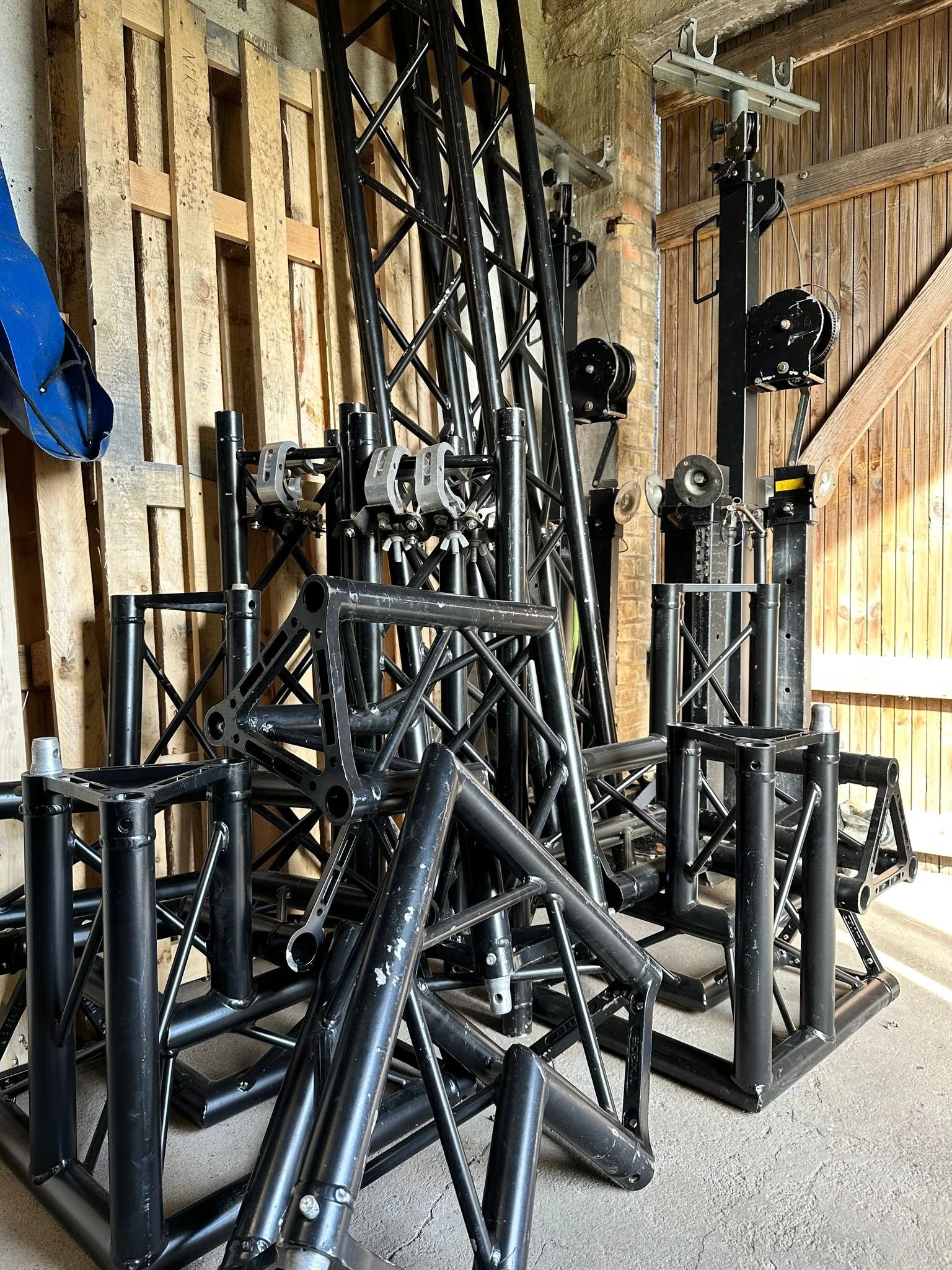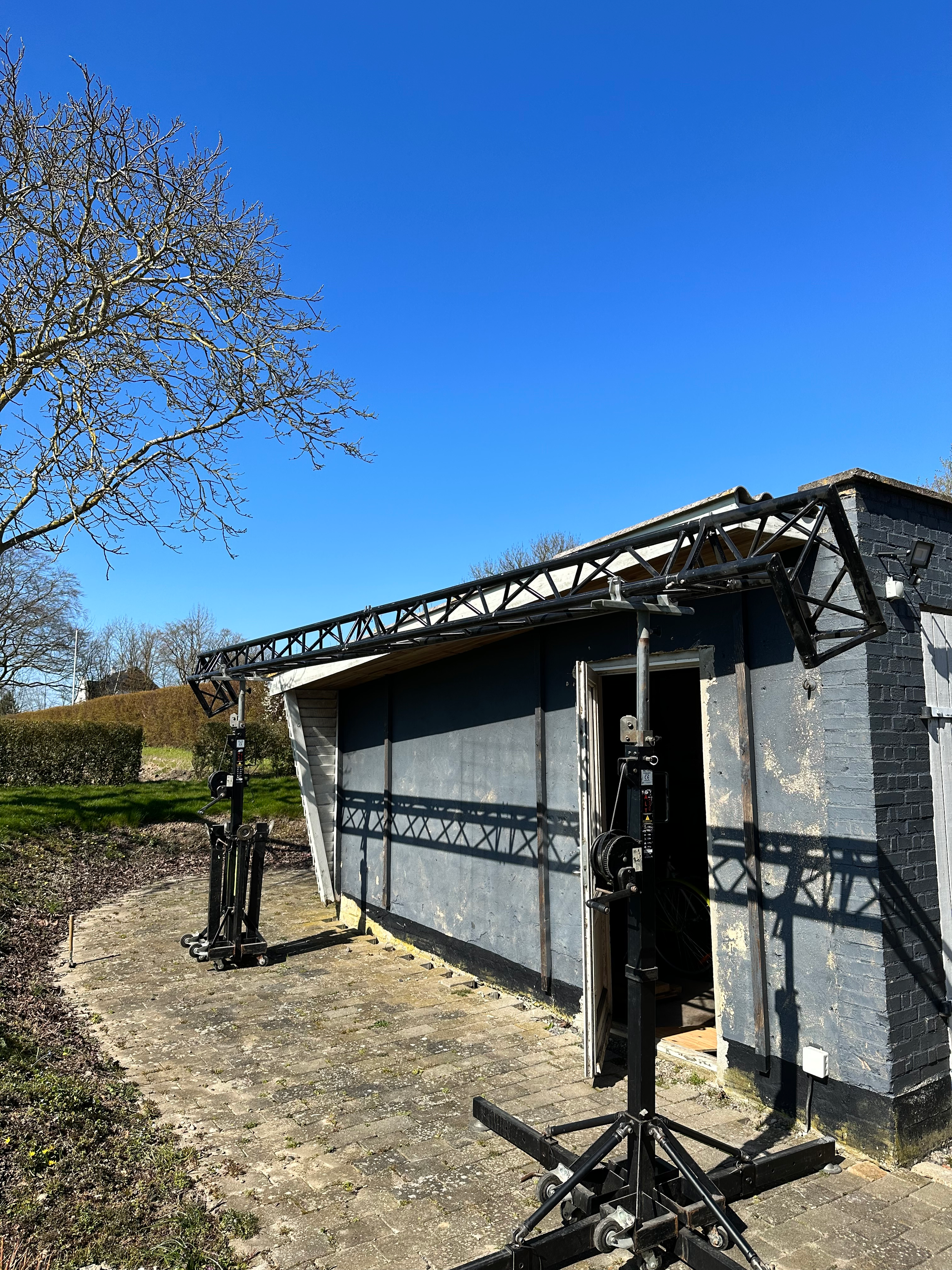 Vi har syv mester bro hjemme, som er et form for stativ, der gør, at vi kan have hele 300kg udstyr 4,8 meter op i luften.